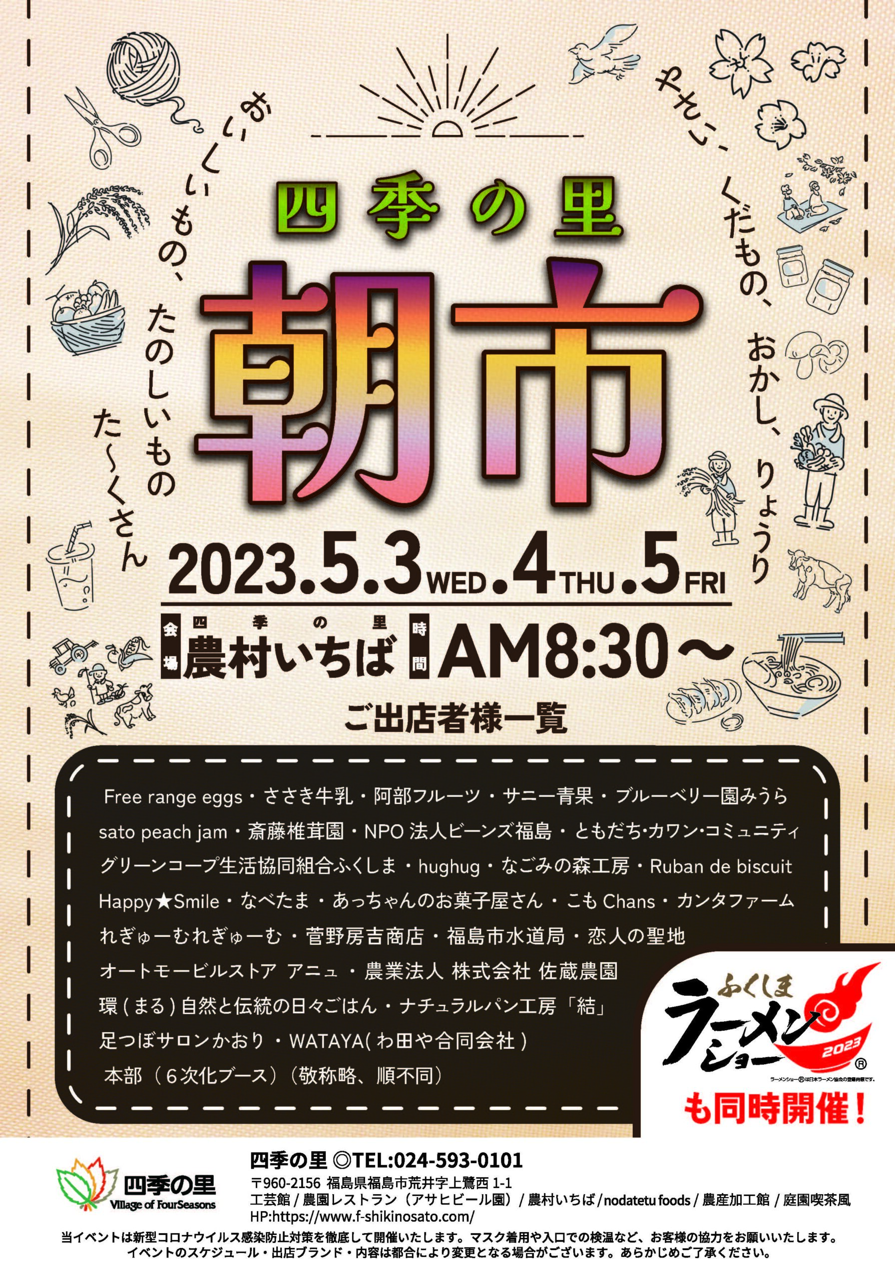 2023年5月3日(水・祝)~5(金・祝)の連日朝8時30分より四季の里農村いちばにて四季の里朝市を開催いたします。