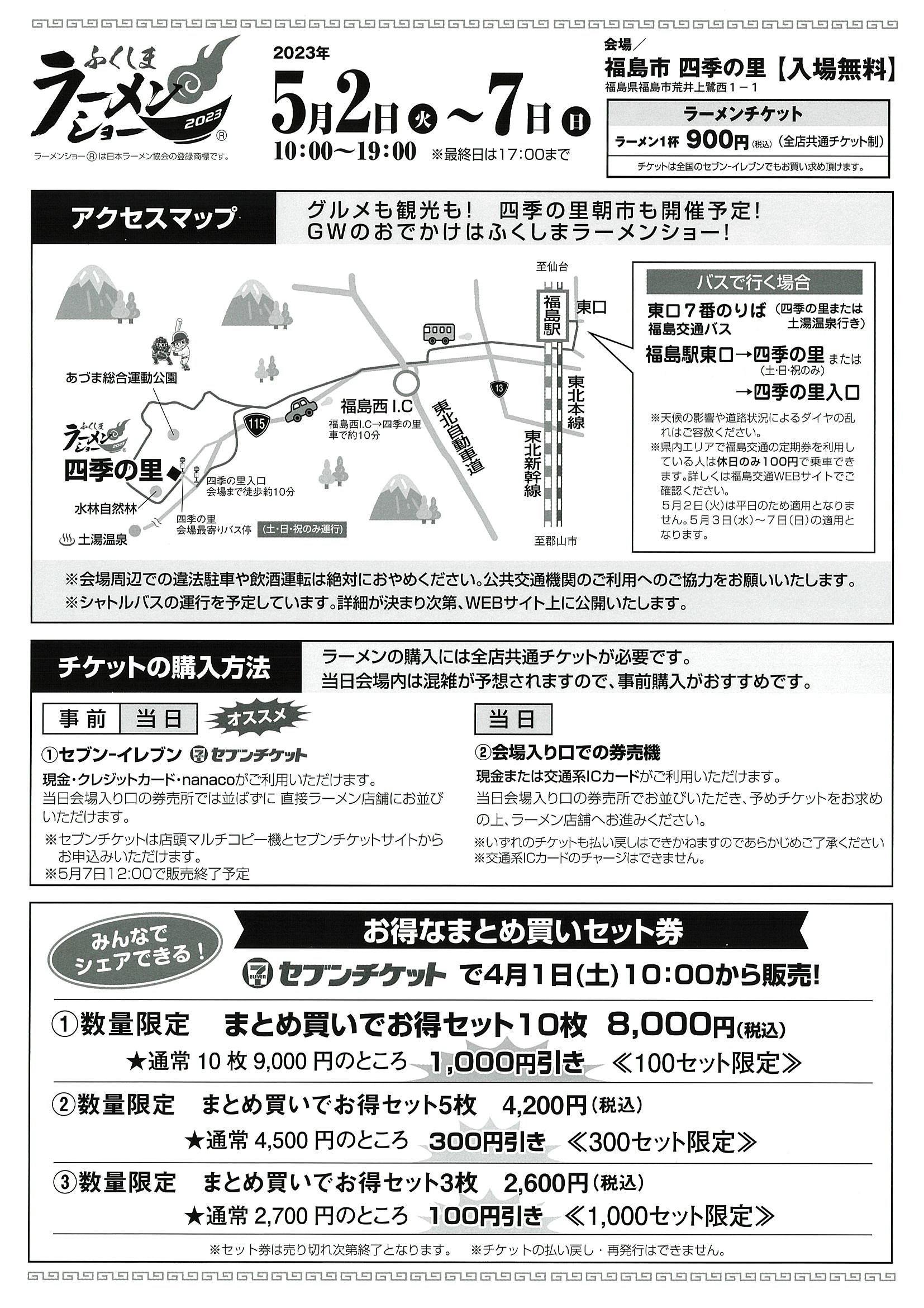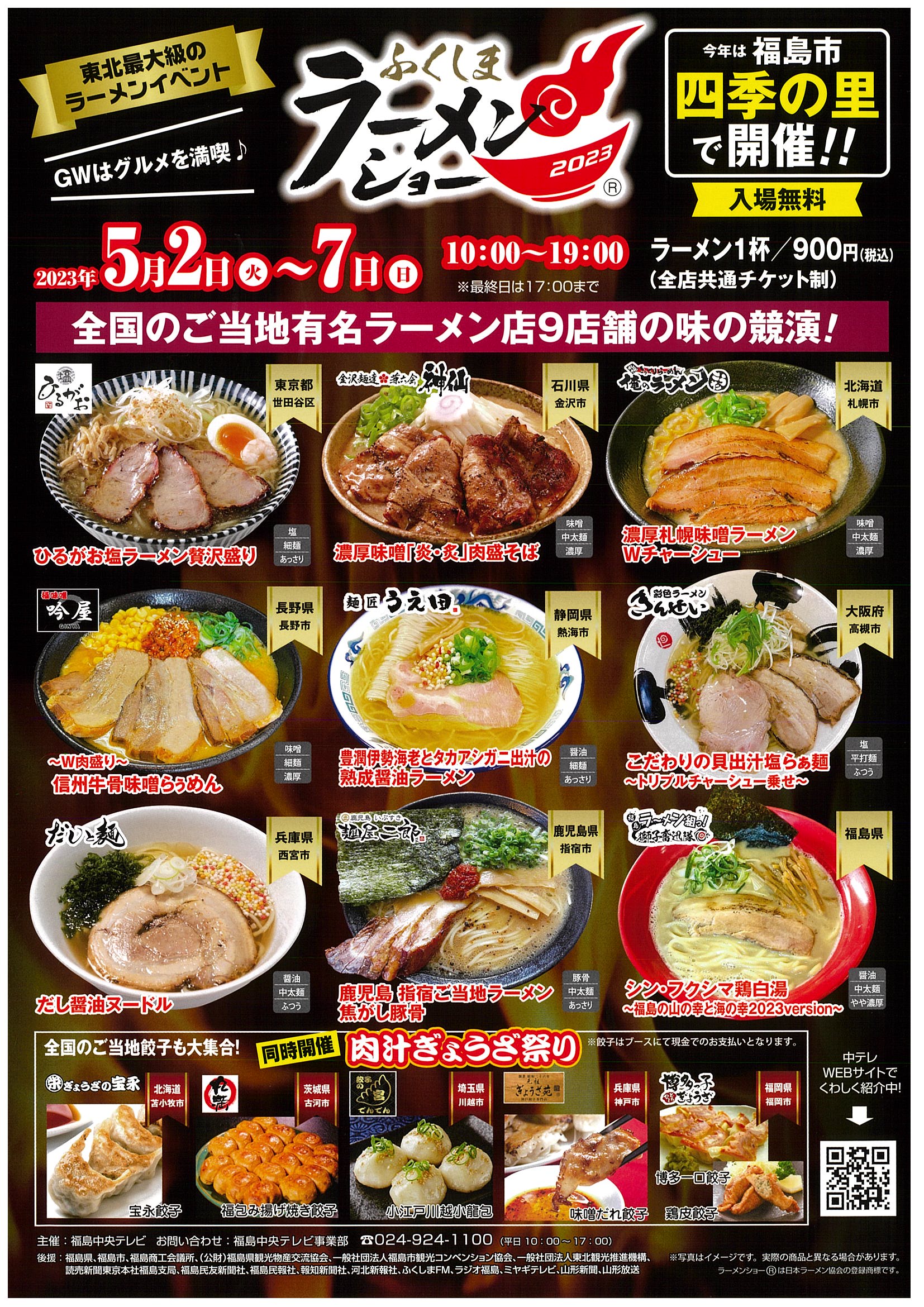 令和5年5月2日(火)~7日(日)、ふくしまラーメンショー2023が四季の里にて開催されます。