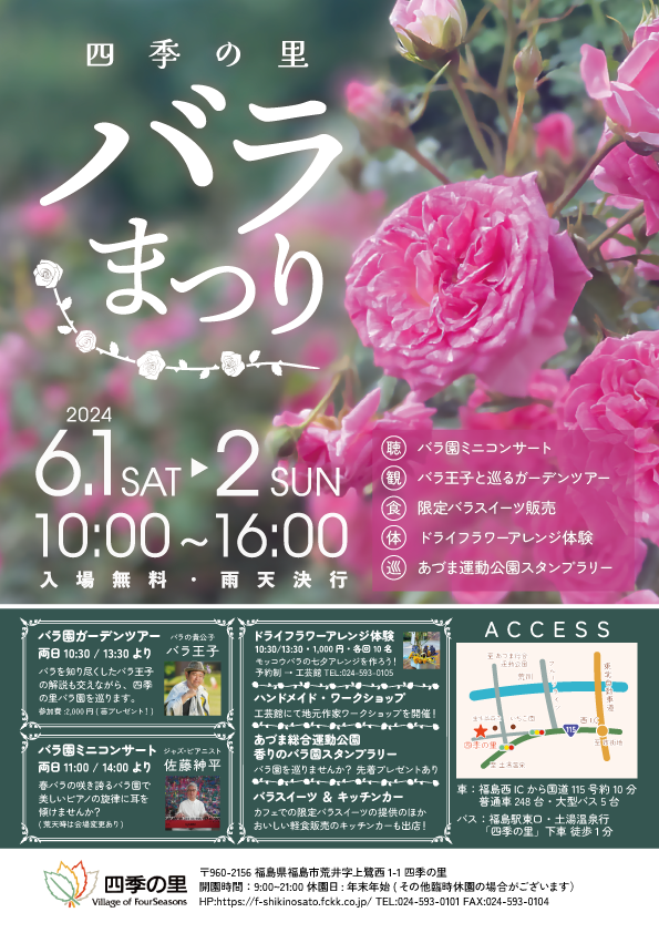 2024年6月1日(土)、2日(日)に四季の里にてバラまつりを開催いたします。