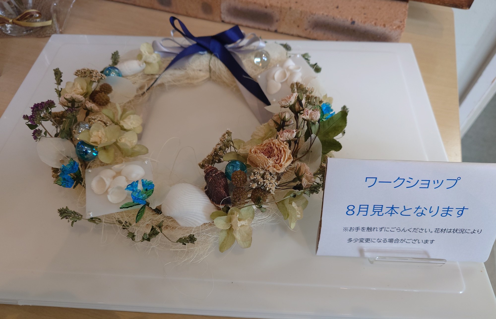 来月は貝殻とドライフラワーとガラス玉を組み合わせた涼しげな