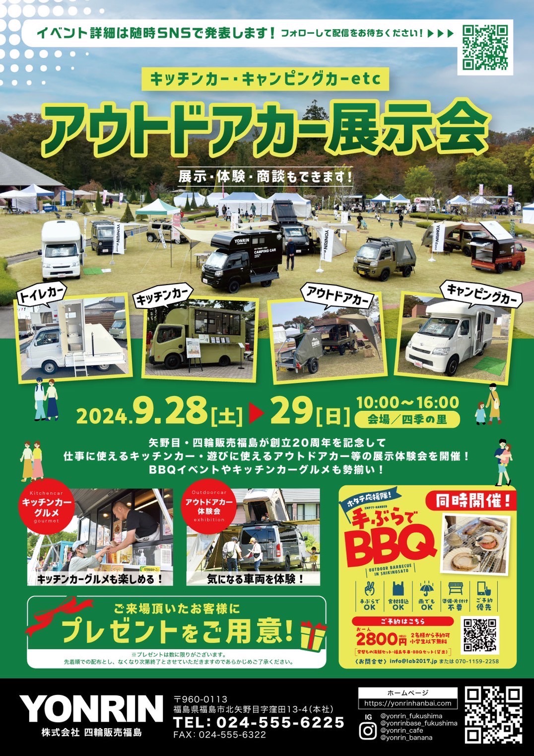 矢野目にある「四輪販売福島」様が創立20周年を記念して四季の里で「アウトドアカー展示会」を開催します。