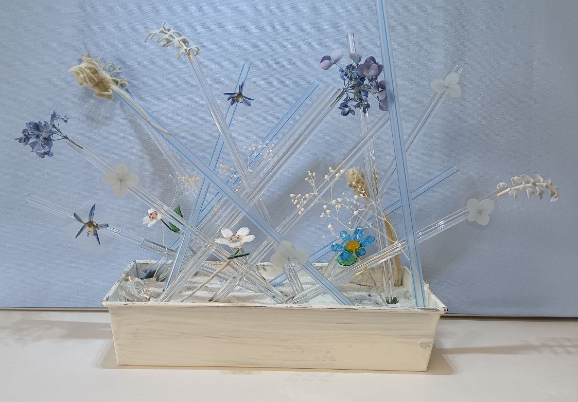 タイトル:「ガラスとドライフラワーのアレンジメント」