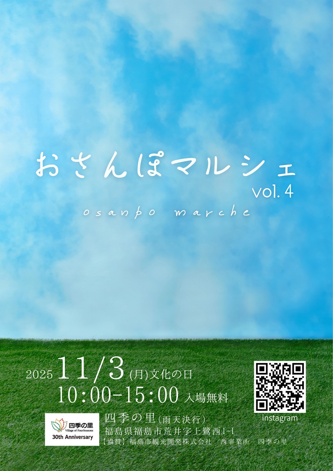 『おさんぽマルシェ』を7年ぶりに開催。福島県内外から65店舗が参加。ハンドメイドを中心に、グリーンや古道具などたくさんのお店が並び、秋空の下でおいしいスイーツやランチも楽しめます。